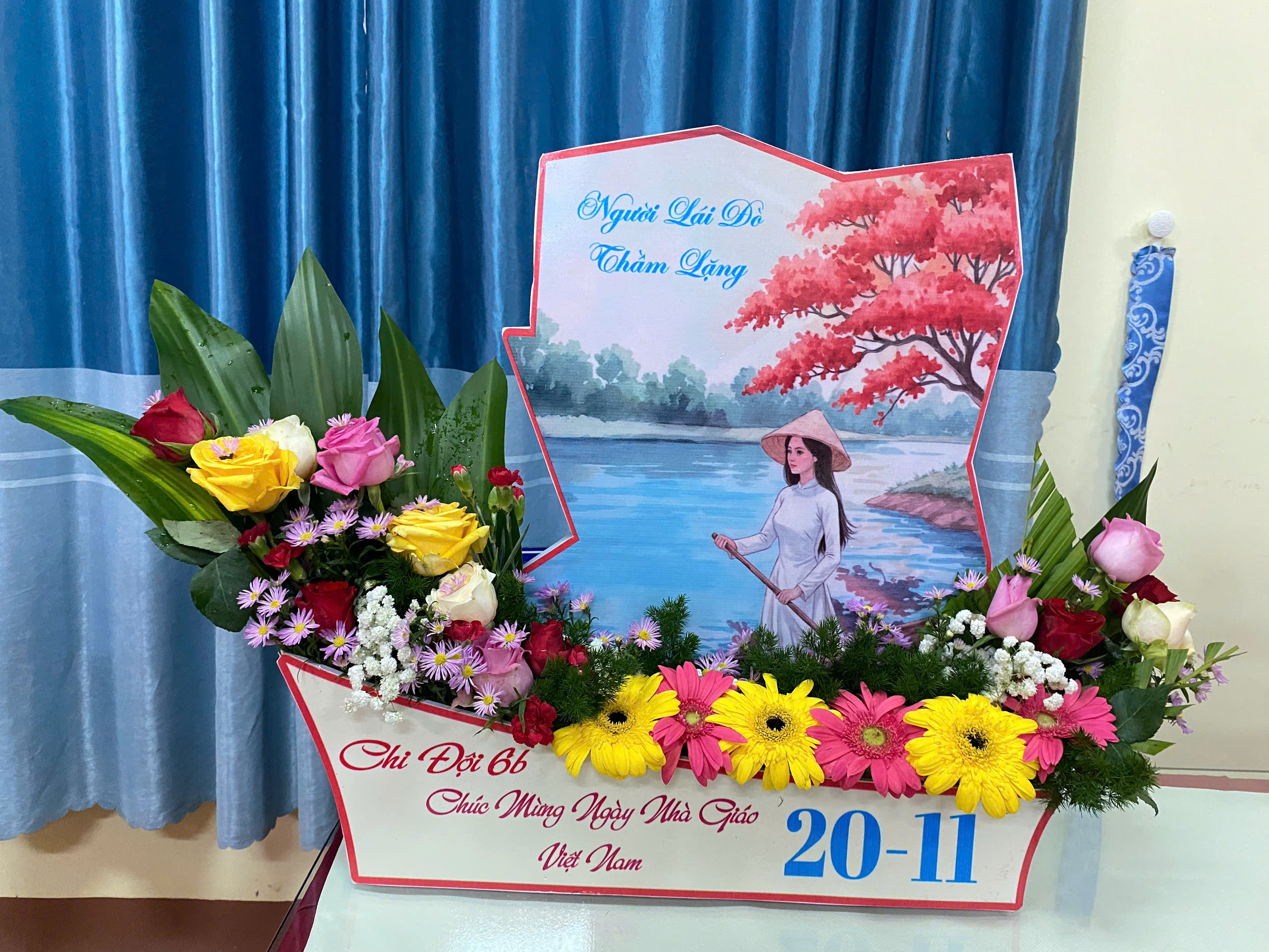 Bình hoa mang hình ảnh con thuyền tri thức, rực rỡ sắc màu, tượng trưng cho những chuyến đò vượt sóng gió của thầy cô.