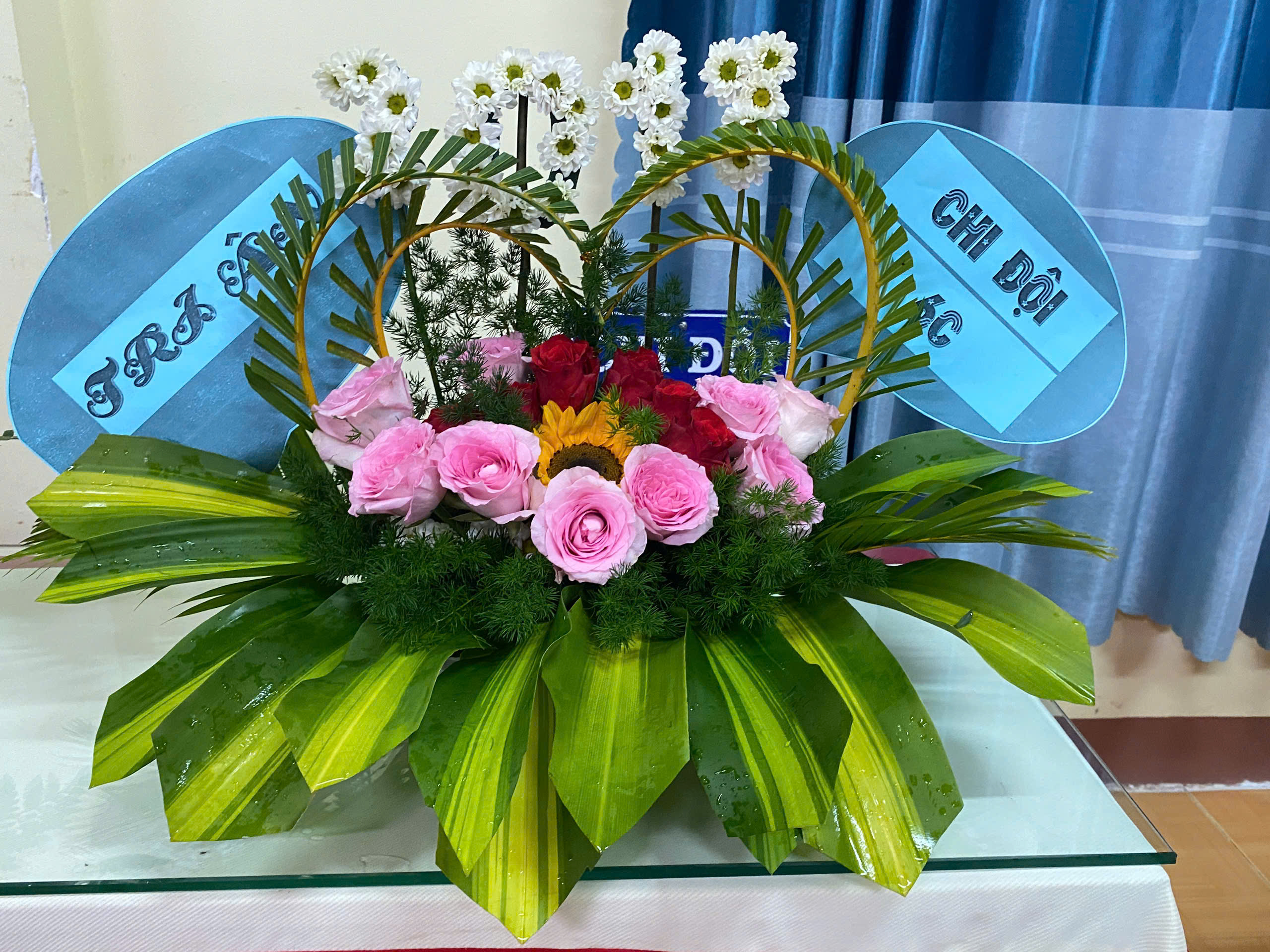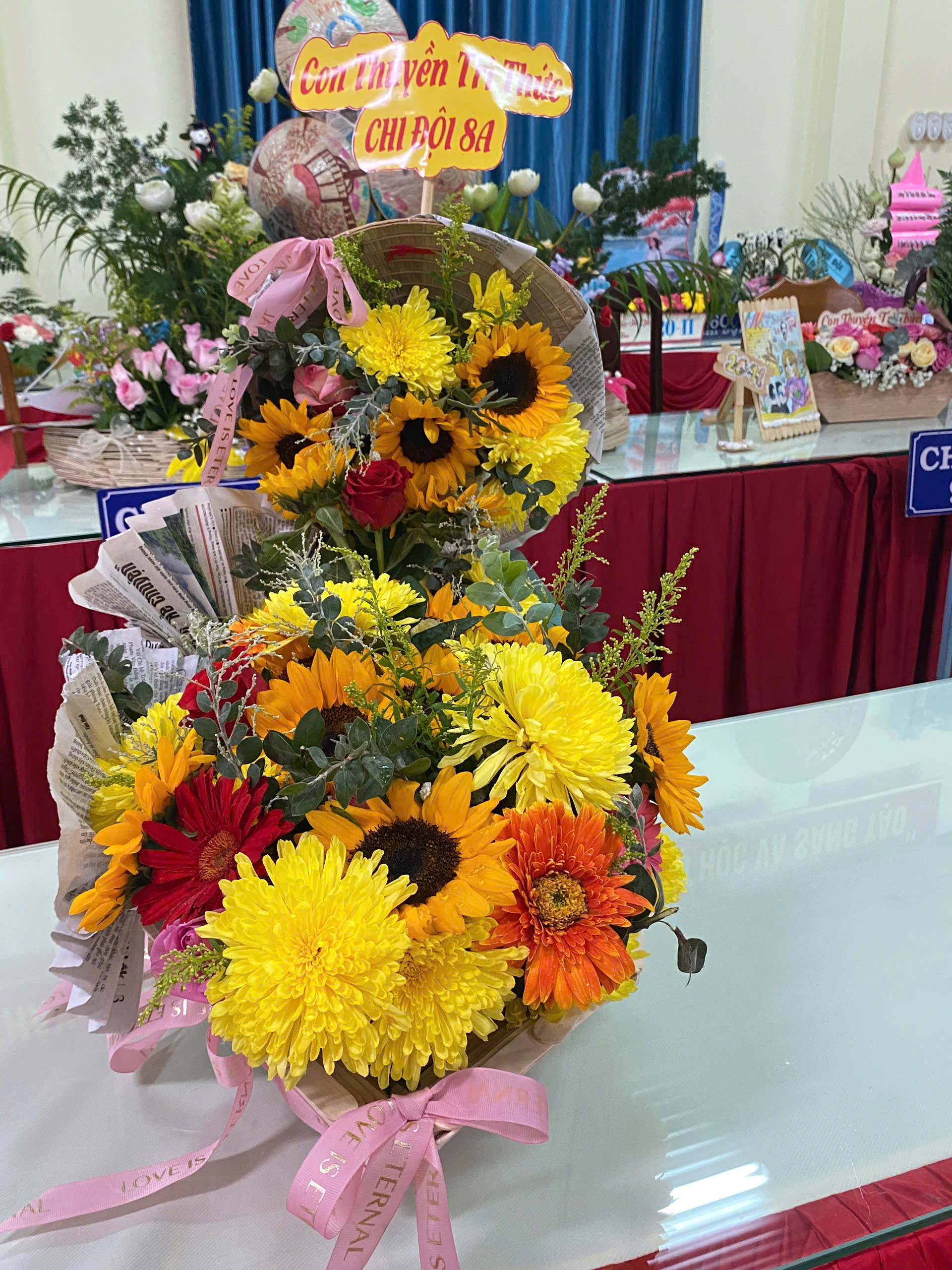 Lẵng hoa với những đóa hoa hướng dương vươn cao, thể hiện sự kính trọng và niềm tin yêu tuyệt đối của học trò.