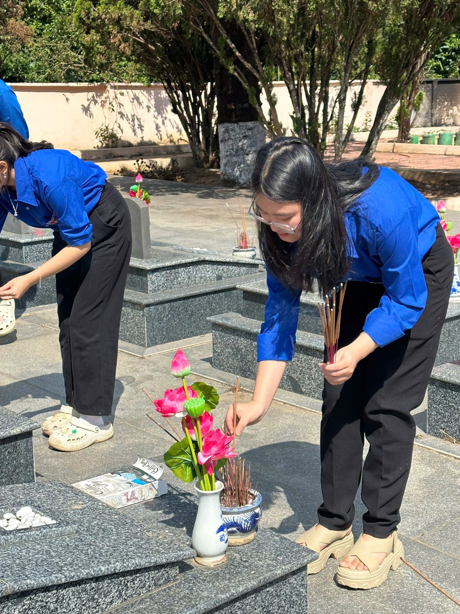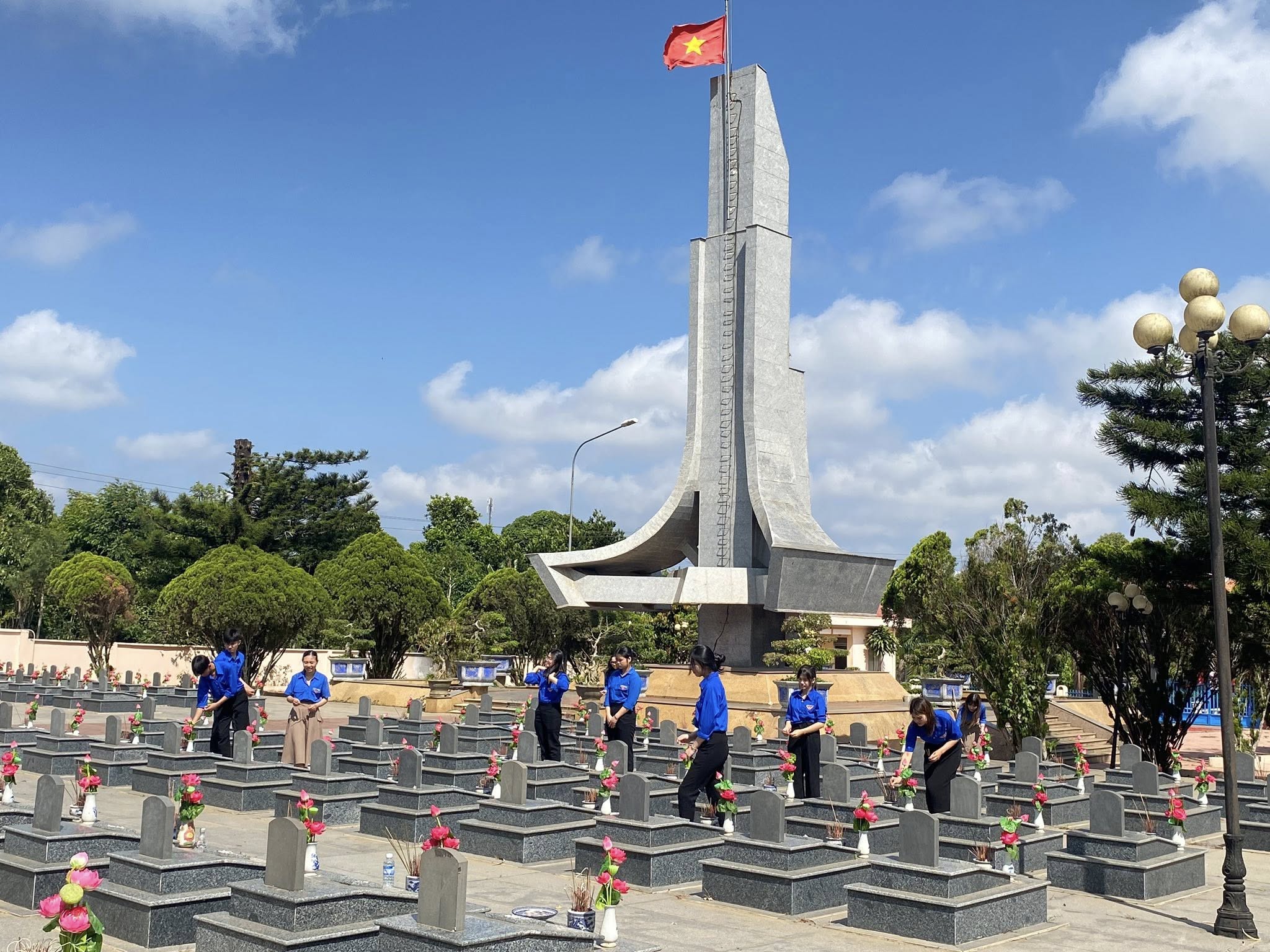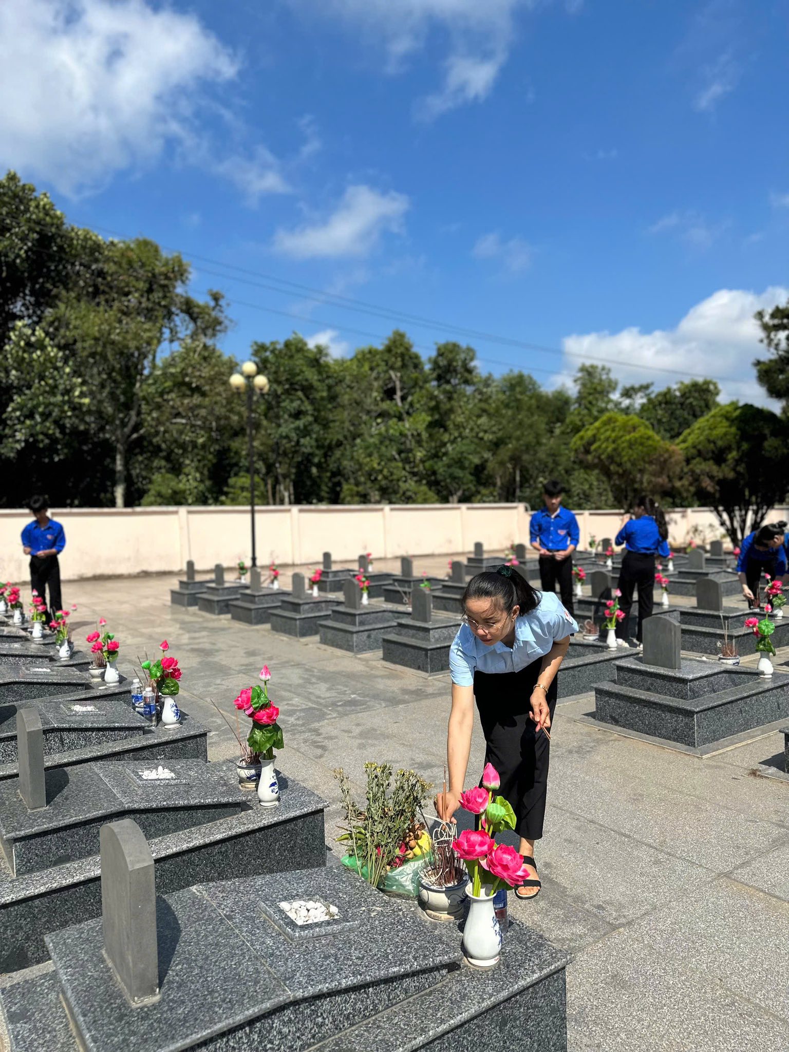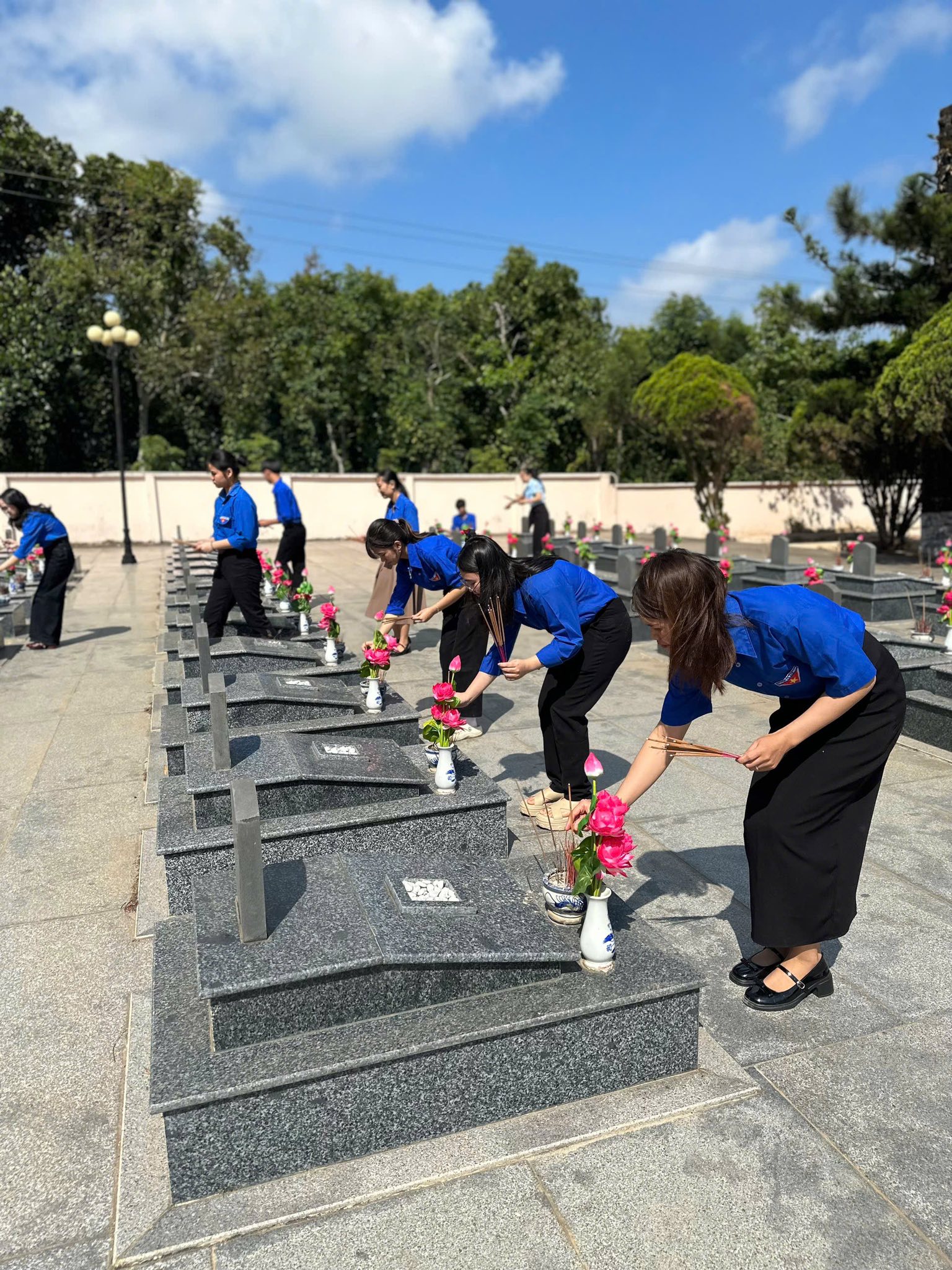 Giữa những hàng bia mộ thẳng tắp, không khí dường như lắng lại. Những bước chân trở nên nhẹ hơn, những ánh mắt trầm xuống, để mỗi em học sinh có thể cảm nhận rõ hơn giá trị của hòa bình hôm nay – điều đã được đánh đổi bằng biết bao máu xương của cha anh đi trước.