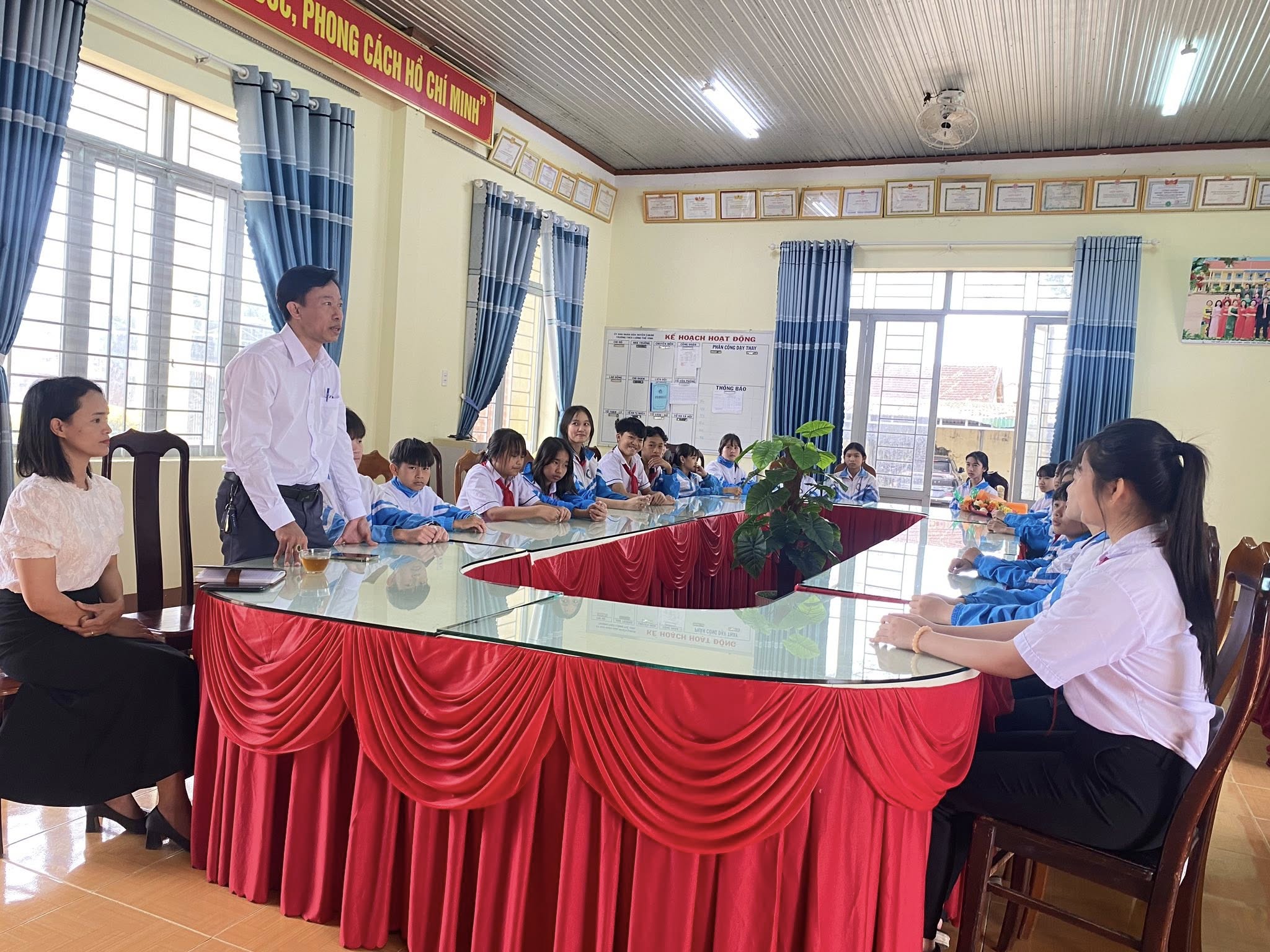 Buổi lễ diễn ra trong không gian trang trọng nhưng không kém phần thân mật. Tham dự buổi gặp mặt có sự hiện diện của thầy Nguyễn Tiến Thương – Hiệu trưởng nhà trường, cô Hồ Thị Thanh Tâm – Phó Hiệu trưởng, cùng đông đảo các thầy cô giáo đang công tác tại trường và đại diện học sinh đến từ 12 lớp.
