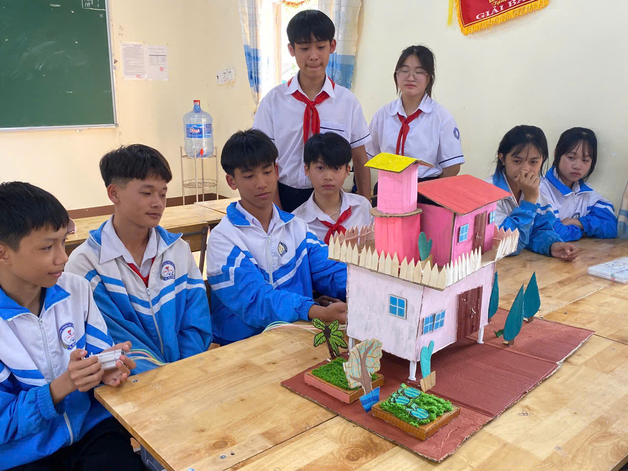 Để sản phẩm thoát ly khỏi dáng vẻ của một “mô hình đồ chơi”, các cô Phan Thị Huệ, Hoàng Thị Anh Tú và Nguyễn Thị Thùy Dung đã đưa ra những góp ý về mặt thẩm mỹ. Từ việc phối màu sắc hài hòa đến cách bố trí bố cục không gian xanh, các cô giúp học sinh hiểu rằng: Một sản phẩm công nghệ hoàn hảo phải đạt được sự cân bằng giữa Công năng và Nghệ thuật.